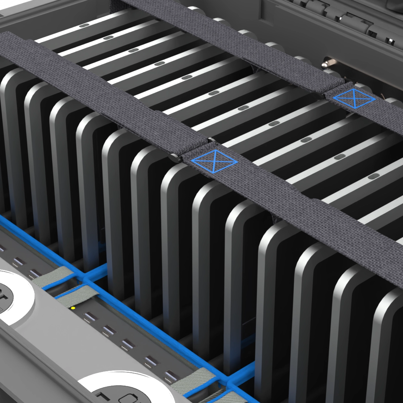 Je 5 Tablet-PCs werden in einem einzeln entnehmbaren Go2Basket gelagert. Klettverschlüsse fixieren die Tablet-PCs , um sie beim Transport sicher in Position zu halten. Das Gehäuse des GoCabby 15 Tablets ist innen zum zusätzlichen Schutz für den Inhalt mit Schaumstoff gefüttert.