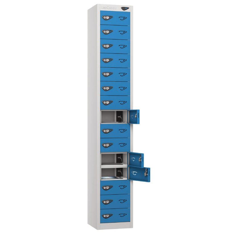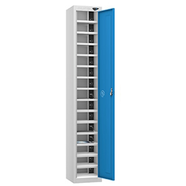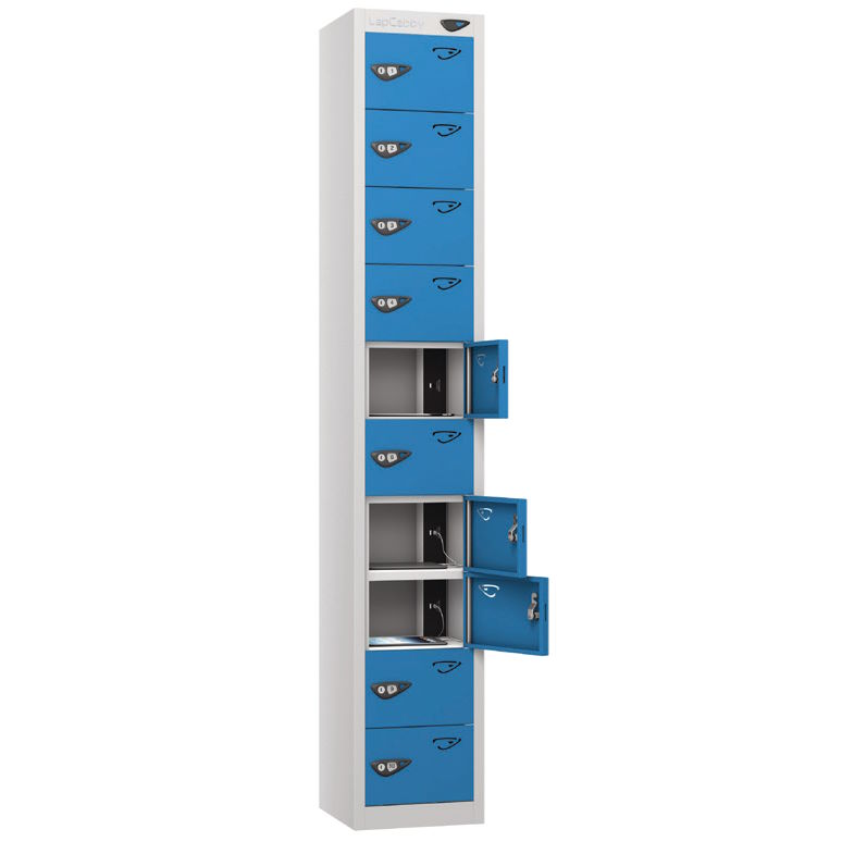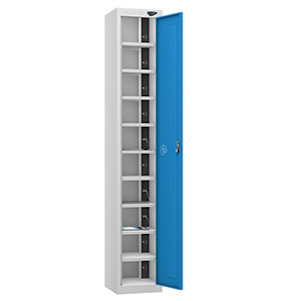 Dieser mit einer Türe absperrbare Stahlschrank zur Aufbewahrung und Ladung von 10 Notebooks oder Tablets bietet hohe Sicherheit bei gleichzeitig geringem Platzbedarf. Der Spind ist mit 4 unterschiedlichen Schlosstypen für verschiedenste Einsatzgebiete erhältlich: individuell programmierbares mechanisches oder elektronisches Zahlenschloß, Drehriegelverschluß oder Zylinderschloß. Je nach Modelltyp unterschiedliche Anschlüsse für USB-A/USB-C oder Netzstrom oder beides decken ein breites Spektrum von Lademöglichkeiten ab.