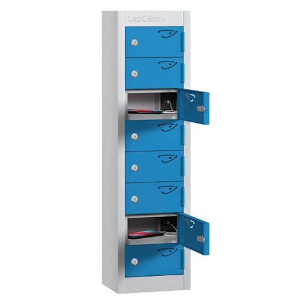 Jedes Notebook wird in einem separaten Fach in horizontaler Position verstaut. Jedes Fach verfügt über eigene Anschlussmöglichkeiten zum Laden der enthaltenen Geräte.