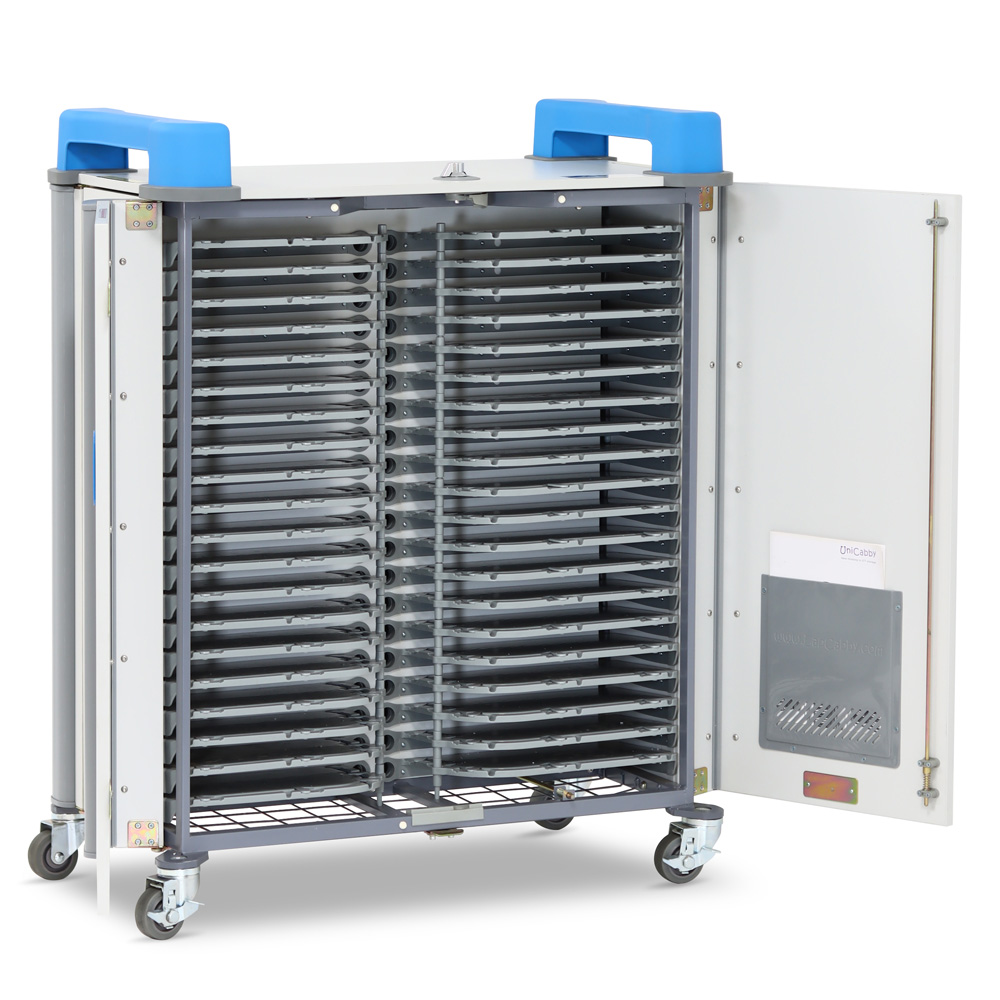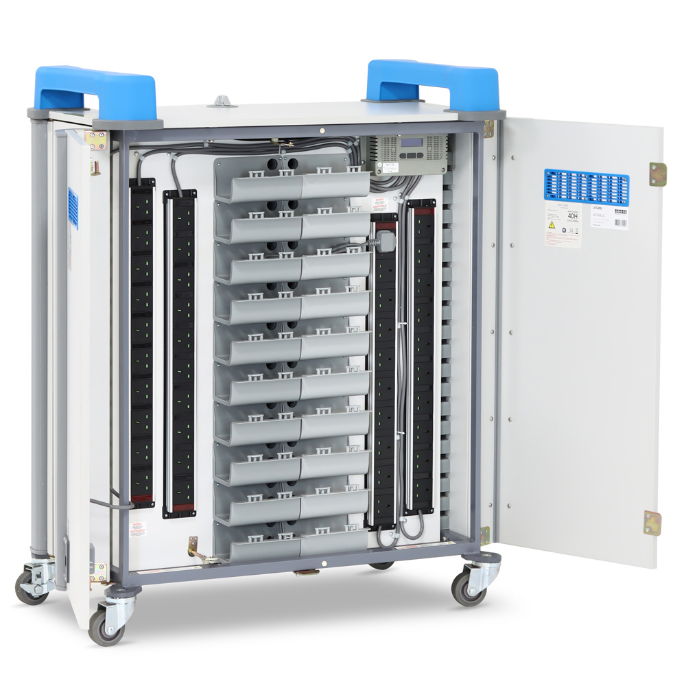 Geringes Gewicht, gummierte Lenkrollen sowie zum Schutz des Inventares ihre Schule gummierte Ecken sorgen, zusammen mit den grossen Haltegriffen für grosse Mobilität dieses IT-Möbels innerhalb der Klasse. Leicht abgewinkelte Einlegefächer gewährleisten eine sichere, ordentliche Verstauung der Geräte auch während des Transportes der Einheit. Jedes Schubfach verfügt über eine clevere Kabelführung zum ordentlichen verstauen der Ladekabel. Speziell geformte Kabelclips fixieren die Ladekabel an bis zu 5 Punkten.